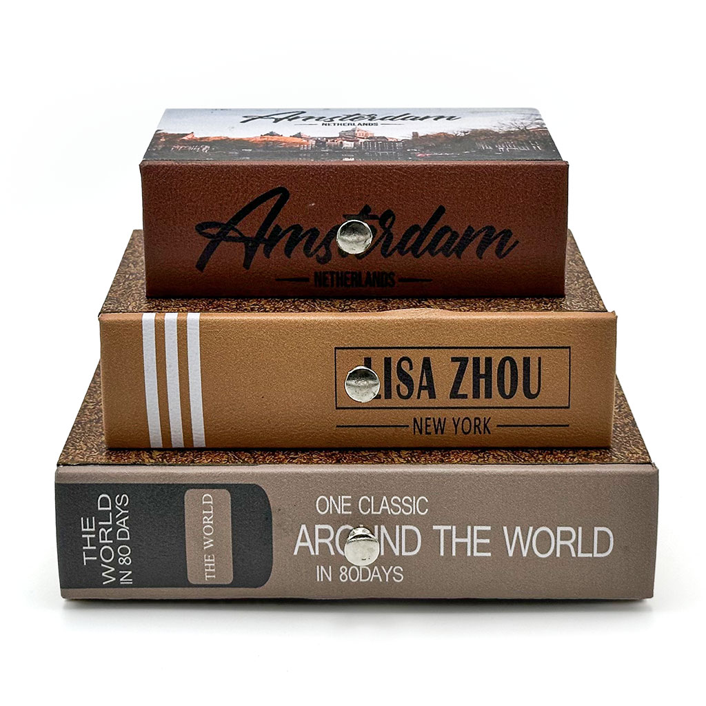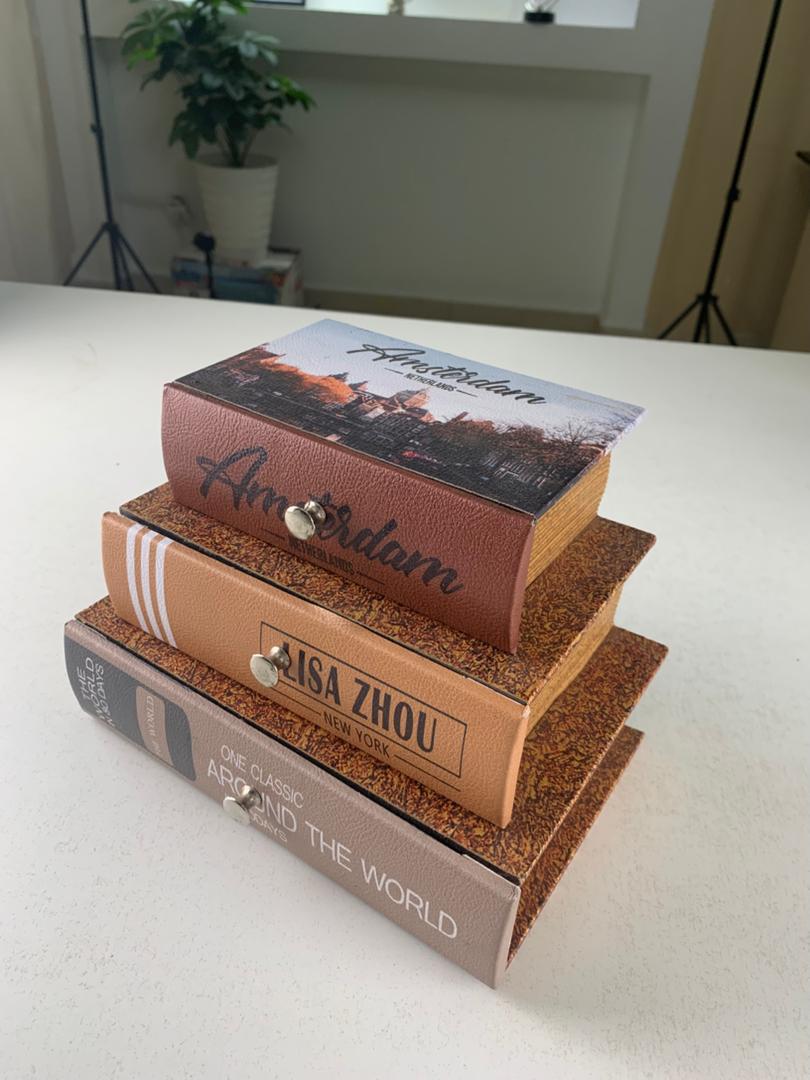 تصميم واقعي بتقنية الخداع البصري - تقليد مثالي للكتب الحقيقية بعناوين مطبوعة: "أمستردام"، "ليزا تشو"، "حول العالم"، إلخ.