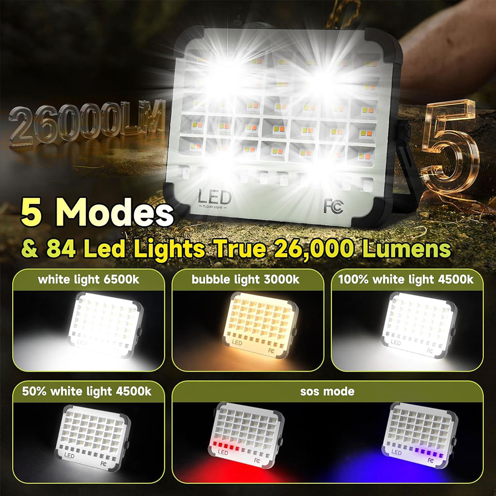 كشاف LED فائق السطوع قابل لإعادة الشحن: مزود بـ 84 مصباح LED مُحسّن، يُوفر هذا الكشاف LED القابل لإعادة الشحن 26,000 لومن بخمسة أوضاع: أبيض، ومصباح، وسطوع 100%/50%، وإشارة استغاثة. تضمن شاشة العرض الذكية لشحن البطارية (25%-100%) إضاءة موثوقة في مواقع البناء أو في حالات الطوارئ.