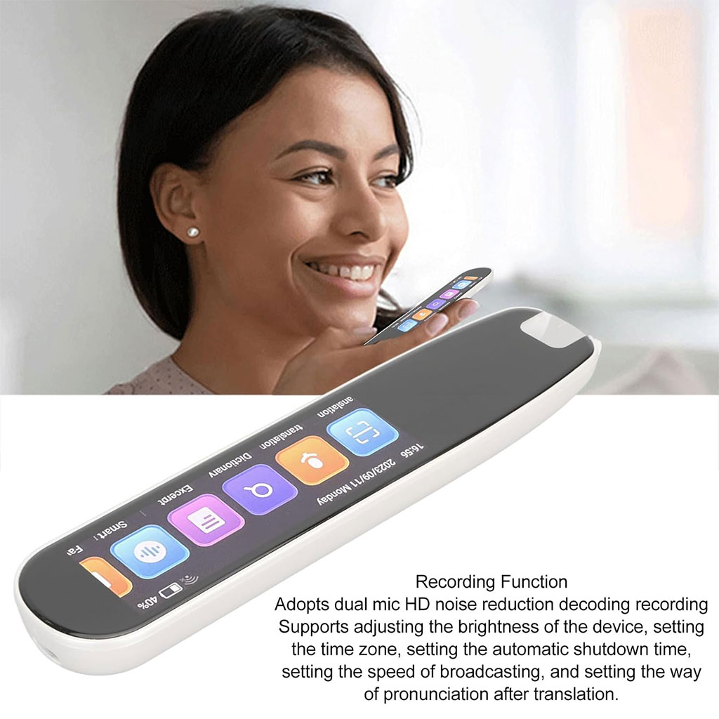 معدل التعرف العالي: يدعم قلم المترجم الصوتي المسح الضوئي عبر الإنترنت وخارجه والترجمة المتبادلة لـ 12 لغة، ومعدل التعرف على دقة المسح الضوئي يصل إلى 99%، يمكنك وضع دقة الترجمة الاحترافية للتفسير الكامل للمعنى الأصلي. 134 ترجمة صوتية: يدعم قلم الترجمة الذكي 134 نوعًا من الترجمة الصوتية بعد الاتصال بالشبكة، ويمكن بث 133 نوعًا من اللغات صوتيًا وعرض النص بعد الترجمة، ويمكن لنوع واحد من اللغات عرض النص بعد الترجمة. مقتطف نصي: يأتي قلم مترجم اللغة مع تقنية ترجمة مكتبة الصوت غير المتصلة بالإنترنت، حتى في حالة عدم وجود شبكة، يمكن حفظ بيانات النص في القلم بمسحة واحدة ويدعم مقتطفات نصية بـ 21 لغة. وظيفة التسجيل: تسجيل بميكروفون مزدوج وفك تشفير عالي الوضوح مع خاصية تقليل الضوضاء. توصيل أجهزة بلوتوث، وضبط السطوع، وضبط المنطقة الزمنية، ووقت الإيقاف التلقائي، وسرعة البث، والنطق بعد الترجمة. القاموس الإلكتروني: يدعم القاموس الصيني الإنجليزي، القاموس الصيني الإنجليزي، القاموس الياباني الإنجليزي، القاموس الصيني، قاموس المصطلحات، شعر أسرة تانغ، كتاب الكلمات الداعم يحتوي على مفردات المدرسة، المدرسة المتوسطة، المدرسة الثانوية، الامتحان، IELTS، TOEFL، SAT، GRE.