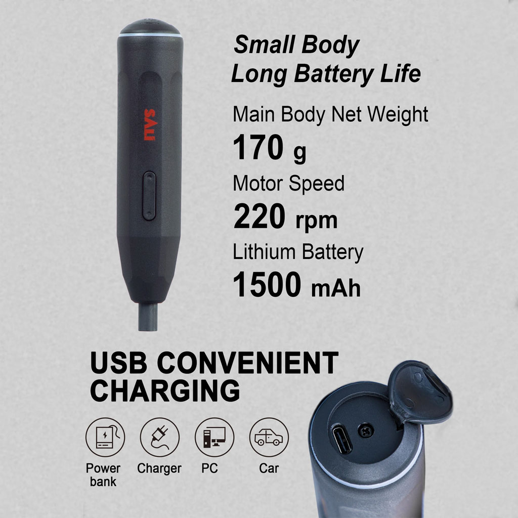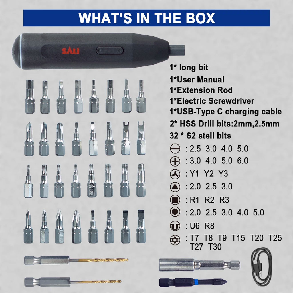 هذه المجموعة الدقيقة من SALI هي الأداة المثالية لهواة الأعمال اليدوية والمحترفين على حد سواء. بفضل تصميمها المدمج وبطاريتها القابلة لإعادة الشحن، توفر كفاءة وسهولة في الحركة لجميع أعمالك الصغيرة في تركيب البراغي.